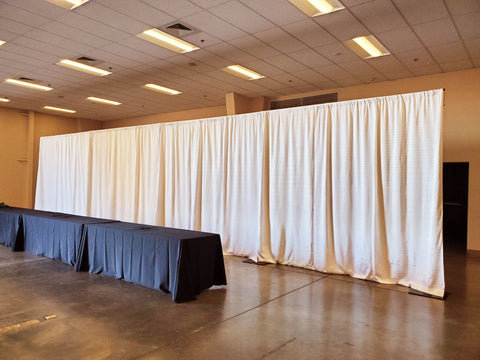 Add a gorgeous wall behind your guest of honor table, decorate a large room, hide a wall, divide an area or add a beautiful backdrop to a focal point at your event with draping. Customize your trade show booth, commercial product launch, compliment an outdoor space. Choose white banjo alone or ask for a quote to add curtain lights and white sheer. Priced by section. Section measures 7.5 to 10 feet wide x 10 feet tall. Installation included. Ask about customized sizes. Photo of close up fabric from manufacturer, all other photos are of Events By Design events.