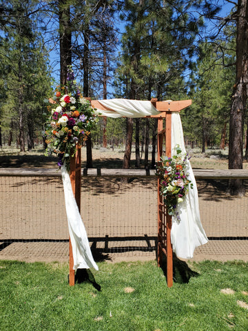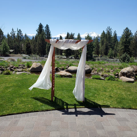 Beautiful classic garden arbor, with lattice work and diamond shaped detail. 57" wide, 28" deep, 79" tall. Choose arbor only, arbor with ivory sheer fabric panel drape or arbor with 18' fresh garland mixed greenery. The basic arbor requires staking or weighting and our installation. Decor optional, ask for details. Price reflects rental rate per event.