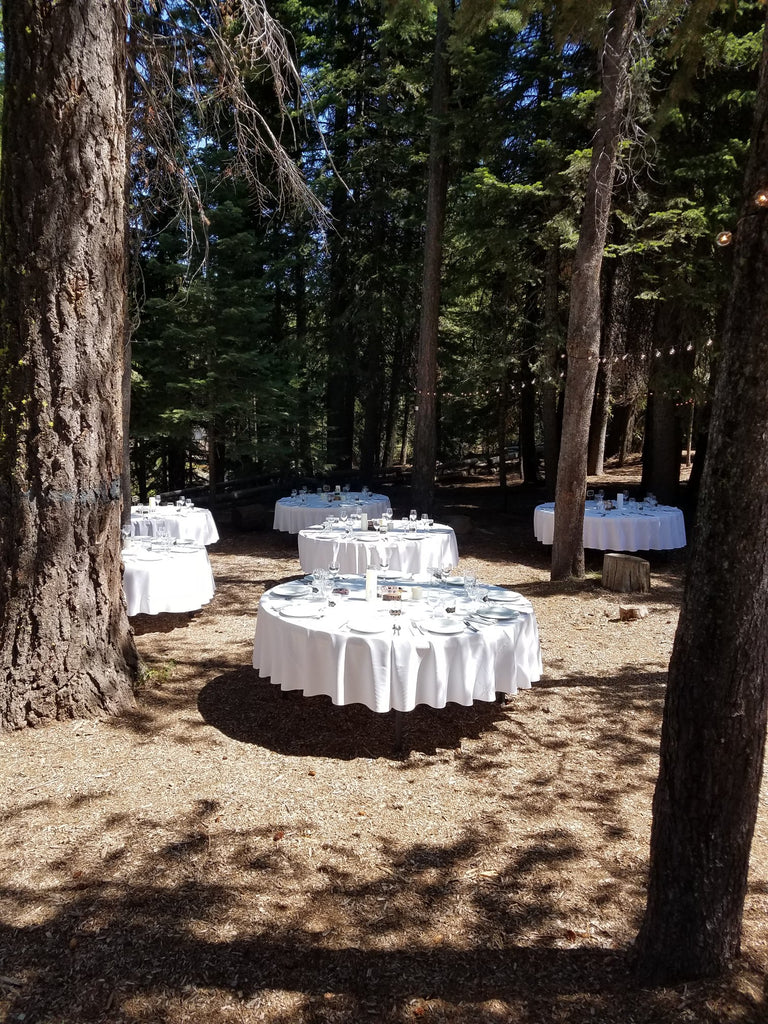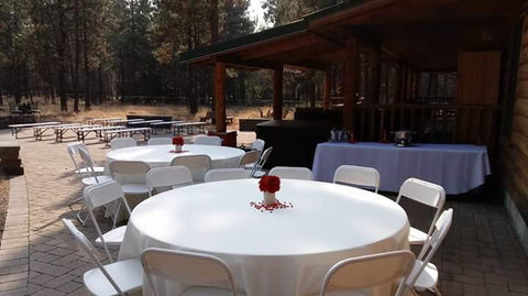 Round, white table seats 10-12. Perfect for large events, wedding party seating and families. Ask about free delivery! Add linens to match your decor by quote. Price reflects rental rate per event.