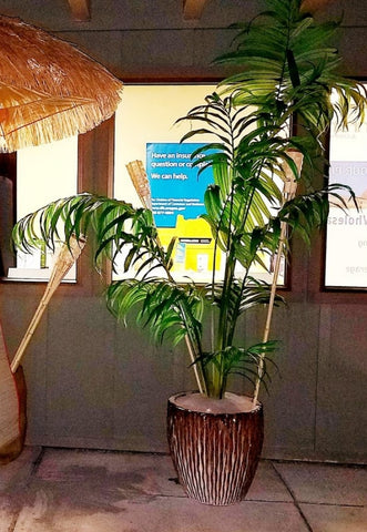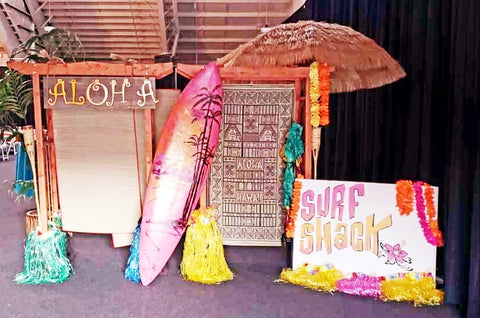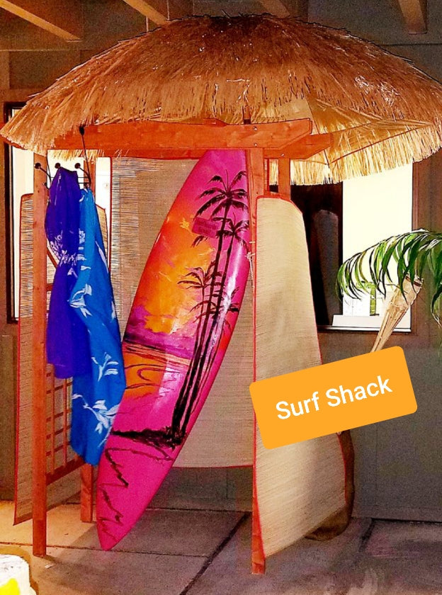 Surfs Up! Check out our surf shack complete with sign, hanging bamboo beach mats, hawaiian shirts and of course an authentic 7 ft surfboard. Add our 8 ft silk palm tree for a great touch. Set up included. Price reflects rental rate per day.