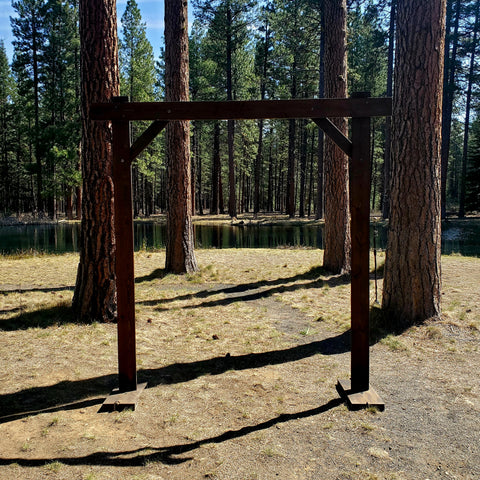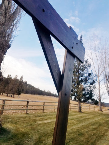 Choose this beautiful dark rustic wood arbor for your ceremony. Measures 7' 5" wide x 7' 5" high. Staking and/or weighting is required to assure stability in the event of our Central Oregon winds. Set up included in rental price. Barrels and Decor available by quote. Price reflects rental rate per event.