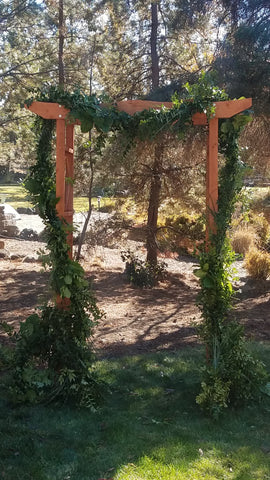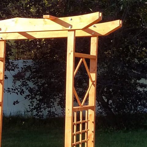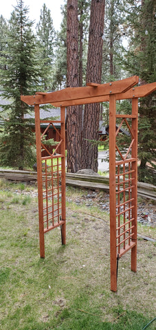Beautiful classic garden arbor, with lattice work and diamond shaped detail. 57" wide, 28" deep, 79" tall. Choose arbor only, arbor with ivory sheer fabric panel drape or arbor with 18' fresh garland mixed greenery. The basic arbor requires staking or weighting and our installation. Decor optional, ask for details. Price reflects rental rate per event.