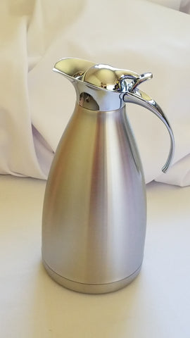 Stainless steel double walled vacuum insulated carafe with press button top. 68 oz capacity. This item can be used with hot or cold beverages.  Price reflects rental rate per event.