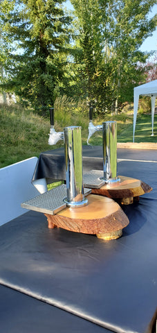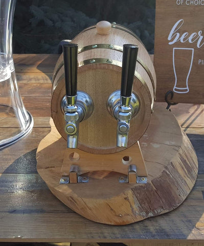 Choose our pair of cylinder style taps each mounted on juniper round or our twin taps mounted in mini tabletop barrel. Includes lines, 5# co2 tank.