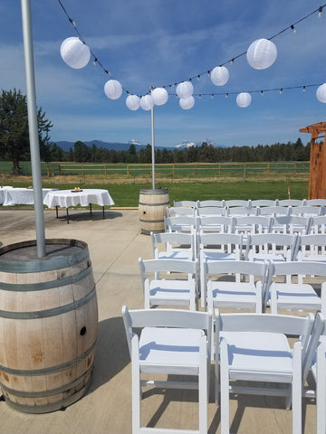 Choose our Medium 4 barrel 100 lights package for the perfect compliment to your dance floor or reception seating. Having a small ceremony? These are the perfect size to create a beautiful atmosphere around your wedding ceremony. Add vinyl lanterns for 3.00 each sizes 8", 10" or 12".