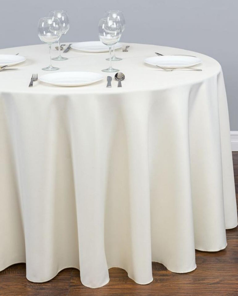 Ivory 120" round linen provides floor drop on 60" round table, 3/4 drop on 72" table price reflects rental rate per event.