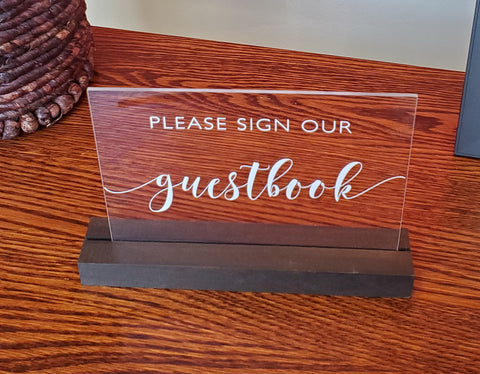 Remind your special guests to sign your guestbook with this casual but elegant sign. Clear plexiglass stands in small wood slot with white scroll letters. Table top small size measures 8" wide x 6" tall including wood stand. Price reflects rental rate per day.