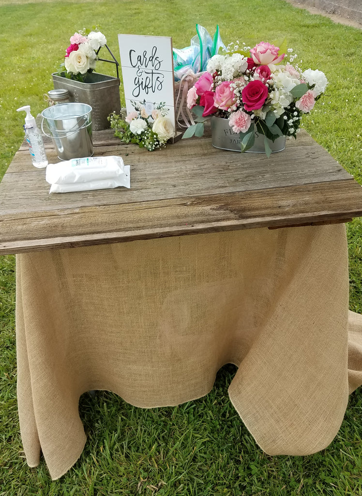 Choose this unique table with authentic barnwood top for your event entry, welcome table, sweetheart table, gift/guestbook table, dessert display or accent corner. Top measures approximately 36,"x 38". Base table draped with burlap for the western, rustic look. Pairs great with our 4 ft or 7 ft tables!  Please note: this is a one of a kind table top.  One in our inventory.  Price reflects rental rate per day.