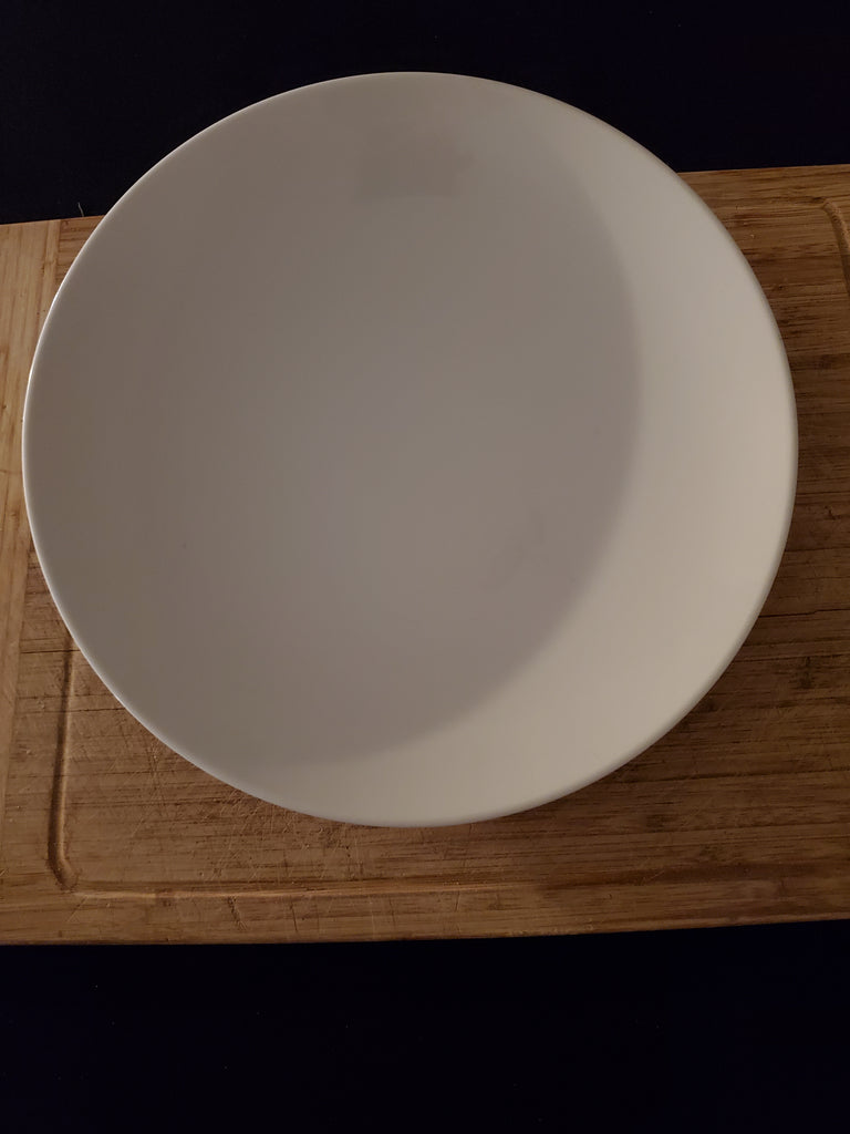 White porcelain tilted round platter. 12" diameter. 1 available. Price reflects rental rate per event.